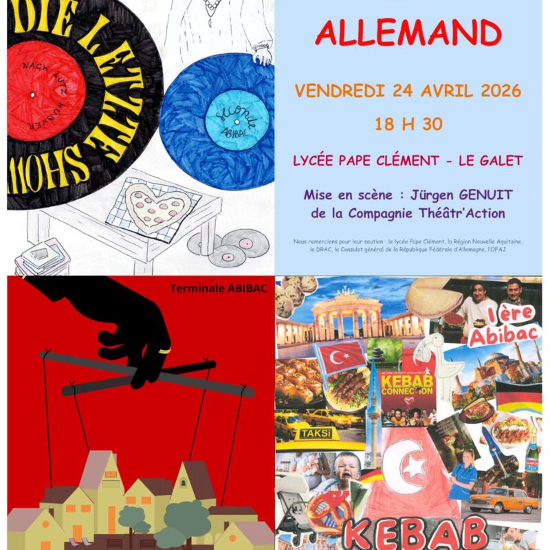 Les élèves de section Abibac – Secondes, Premières et Terminales – ont le plaisir de vous présenter les pièces travaillées dans le cadre du projet Théâtre avec la compagnie Théâtr’Action.