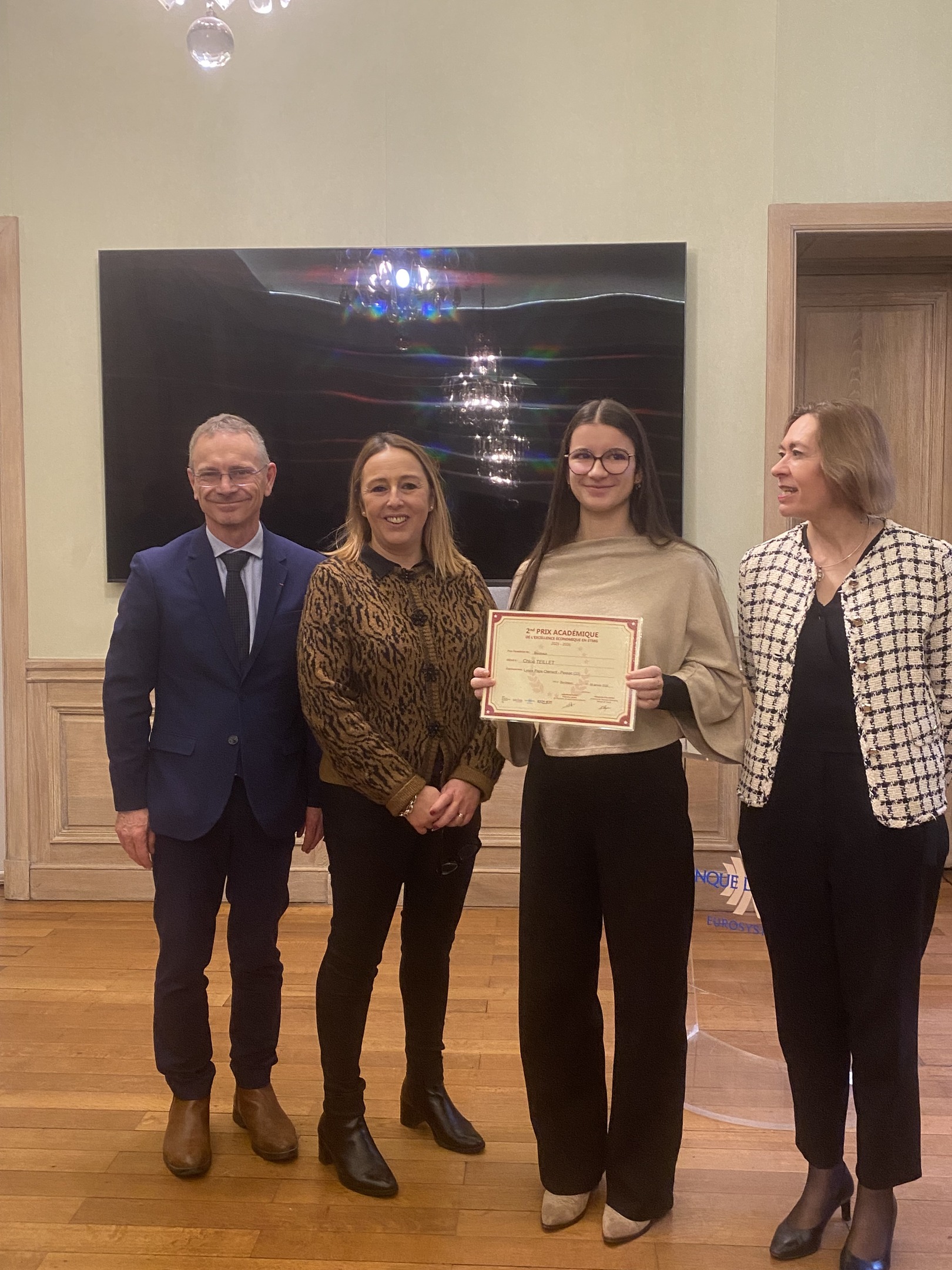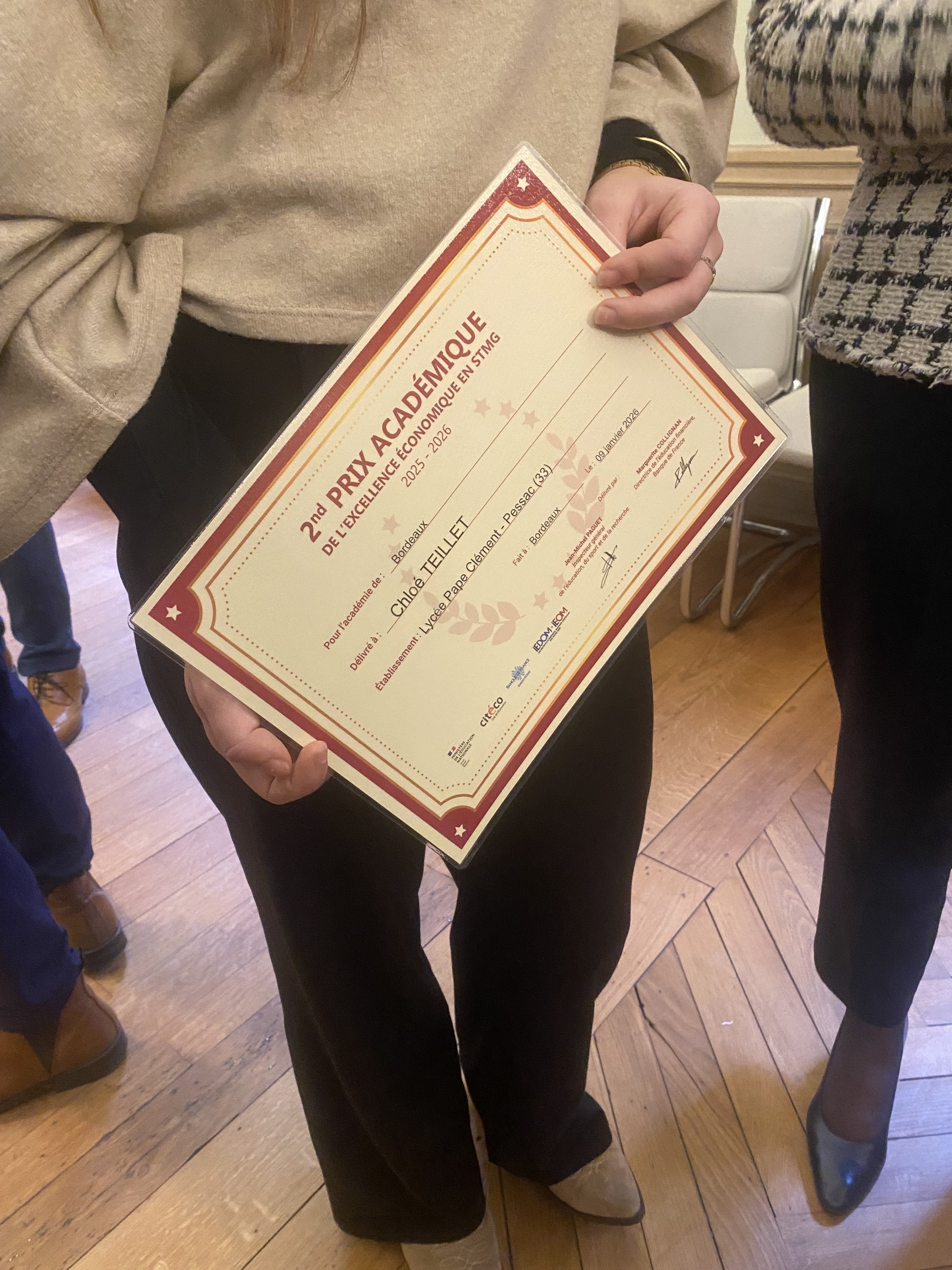Nous sommes ravis de féliciter Chloé TEILLET, élève en terminale STMG, qui a décroché la 2ème place au Prix de l’Excellence Économique en STMG. Cette distinction lui a été remise lors d’une cérémonie tenue le vendredi 9 janvier 2026 à la Banque de France à Bordeaux.
